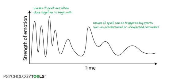 Abbildung: Trauer fühlt sich oft so an, als ob sie in „Wellen“ käme. Anfangs fühlen sich die Wellen intensiv und häufig an, aber mit der Zeit neigen sie dazu, weiter voneinander entfernt zu sein und sich leichter beherrschbar anzufühlen.